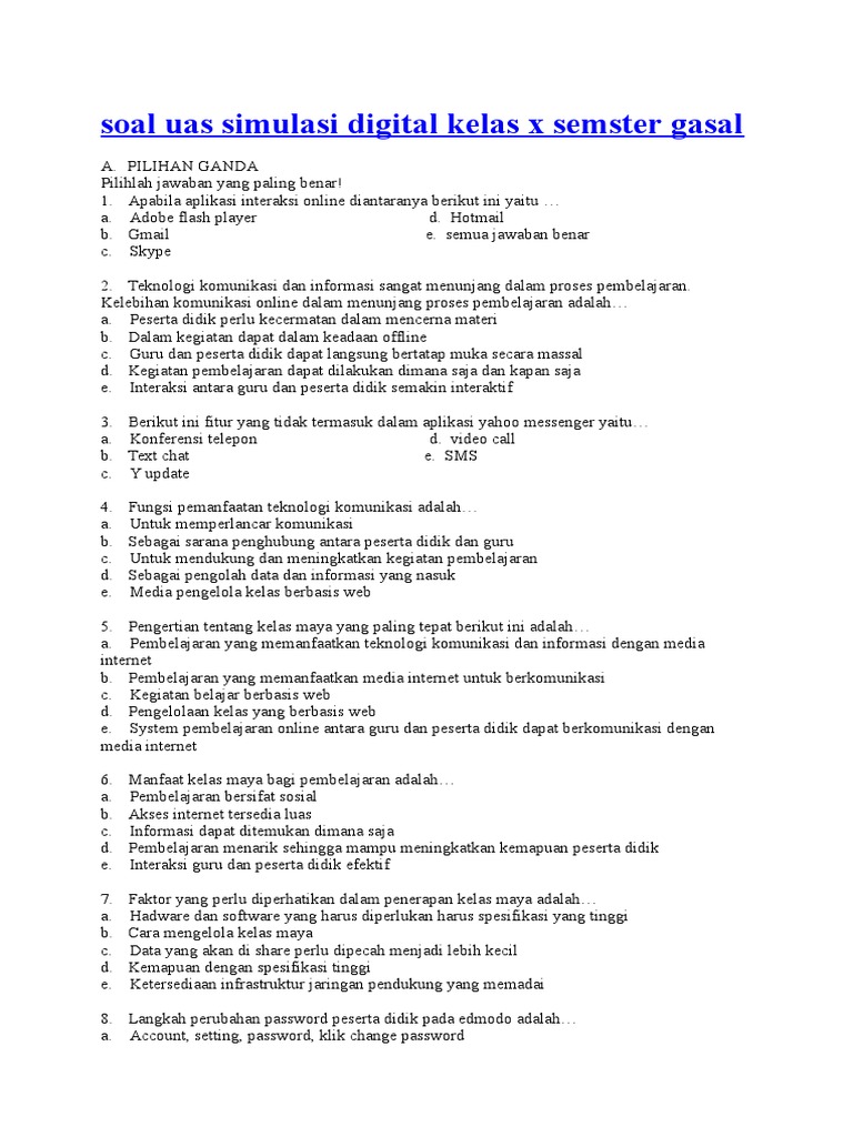 Hai sobat soal prediksi, di kesempatan kali ini admin akan membagikan latihan soal bengkel di keseluruhan jurusan pada mata pelajaran simulasi digital. Soal simulasi digital kelas 10 ini diperuntukkan bagi adik adik yang hendak mengikuti persiapan ujian semester ganjil gasal atau sebagai bahan latihan dan bahan ajar bagi guru mapel produktif. Soal pas simdig kelas x ini terdiri dari 30 soal pilihan ganda beserta kunci jawabannya. Soal ukk simulasi digital simdig semester 2 kelas x smk untuk tkj dan rpl yang bisa dijadikan referensi bagi anda. View soal dan jawaban simulasi digital kelas x.docx from widya kartika 2010.0908 at sman 1 semarapura.